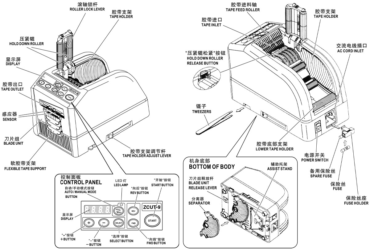 Máy cắt băng keo tự động ZCUT-9 FUMA được thiết kế nhỏ gọn, tối ưu diện tích làm việc và dễ dàng bố trí trên bàn thao tác. Cấu trúc máy gồm các bộ phận chính: